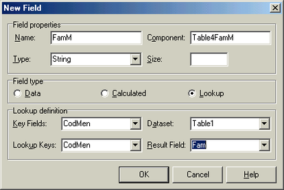 В редакторе полей DataModule1.Table4 добавим поля FamM, FamP. Отредактируем их DisplayLabel на Фамилия менеджера, Фамилия покупателя. Установим в False свойства Visible полей CodMen, CodPok.