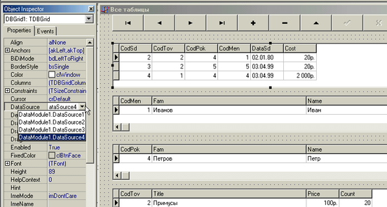 Зададим свойству DataSet компоненты DataSource1 значение Таble1, а компоненты DataSource2 – Таble2 и т д. После этого отображаемые компоненты получат доступ к данным из таблиц БД