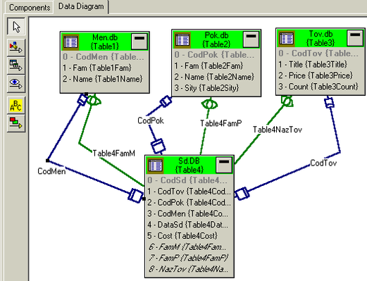 На диаграмме можно разместить и отдельные поля. Изображения связей между дочерними и родительскими блоками отображаются на диаграмме автоматически линиями со светлой стрелкой. Удалить их с диаграммы невозможно. Это первый тип связи. Таковы, например, связи между таблицами и их дочерними полями (Pok.Db и CodPok, Fam, Name, City), между Session и Alias, между Alias и таблицами.. Данный тип связи можно установить с помощью Propety.