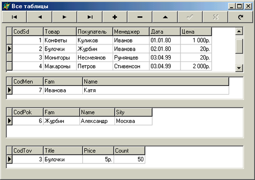 в модуль данных нужно дополнительно ввести таблицы (Table 5, Table 6, Table 7), основанные на Men.db, Pok.db, Tov.db, и дополнительные DataSource.