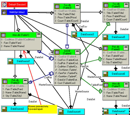 Третий тип связей отображается линией с жирной закрашенной стрелкой, около которой появляется надпись с именем свойства, посредством которого установлена связь. Связь DataSet отображает связь между источником данных и набором данных, осуществленную свойством DataSet. А связь, около которой написано MasterSource, отображает связь через свойство MasterSource вспомогательных таблицы с главной таблицей SD.DB.