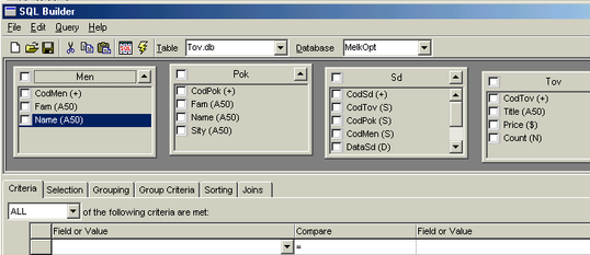 Далее в списке Database выбирается псевдоним базы данных и в окне Table последовательно из списка имеющихся таблиц – таблицы, нужные для формирования запроса.