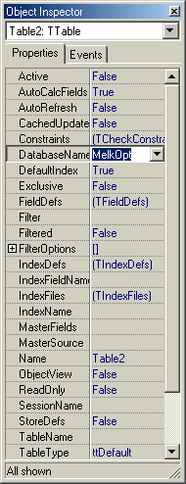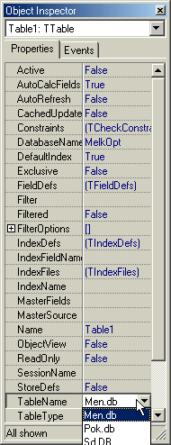Теперь осталось связать компонент Tablel с необходимой таблицей базы данных. Для этого служат два свойства компонента Table: DatabaseName и TableName. Прежде всего, надо установить свойство DatabaseName. В выпадающем списке этого свойства в Инспекторе Объектов вы можете видеть все доступные BDE псевдонимы баз данных. Выберите из этого списка псевдоним MelkOpt, который мы ввели ранее