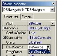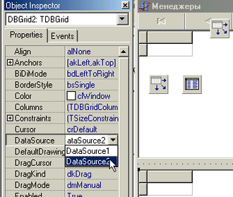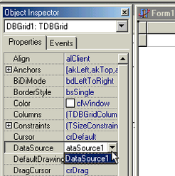 Выделите на форме компонент DBGridl и щелкните на его свойстве DataSource в Инспекторе Объектов. Вы увидите выпадающий список, в котором перечислены все имеющиеся на форме источники данных. В нашем случае имеется только один источник данных — DataSourcel. Установите его в качестве значения свойства DataSource.