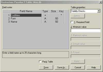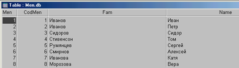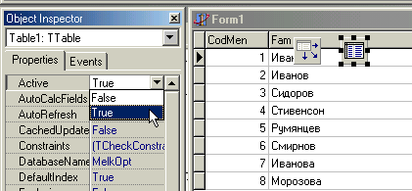 После этого можно устанавливать значение свойства TableName. В выпадающем списке этого свойства перечислены таблицы, доступные в выбранной базе данных. Выберите таблицу Men.db.