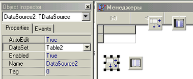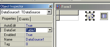 Далее надо установить связь между источником данных и набором данных. Выделите компонент DataSourcel и найдите в Инспекторе Объектов его главное свойство — DataSet. Щелкните на этом свойстве и из выпадающего списка выберите Tablel (если бы у вас было несколько компонентов — наборов данных, то все они были бы в этом списке).