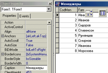 Выполните программу После появления формы нажмите клавишу Insert и введите три фамилии новых менеджеров.