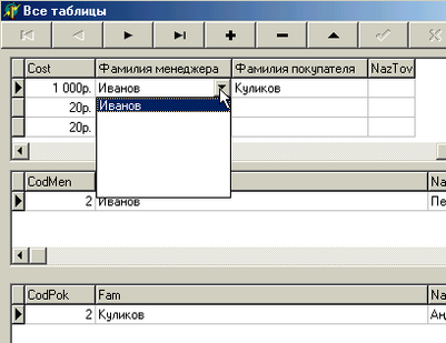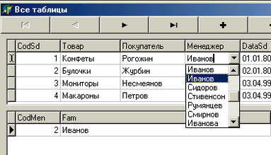 Очень легко устанавливаются связи между таблицами. Так , для установки связи между таблицами менеджеров и сделок нужно нажать левую кнопку мыши на CodMen и не отпуская протащить на поле CodMen таблицы сделок. Аналогично устанавливаются все связи.