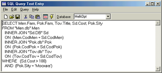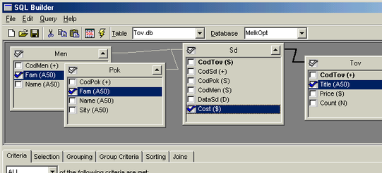 В нижнем окне на закладке Criteria, если нужно указываем дополнительные критерии выбора. Так, например, если нужно выбрать сделки с объемом более 100, то перетаскиваем мышкой в поле Field or Value – Cost из таблицы Sd, в Compare из списка выбираем >, а в третьем поле Field or Value указываем 100.