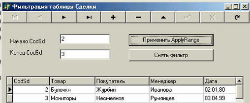 Откроем проект просмотра таблиц базы MelkOpt. Изменим заголовок формы на значение Фильтрация таблицы сделки, добавим две Label, два Edit и две кнопки Botton. Установим свойства Caption у меток и Button, свойство Text у Edit (1 и 1000 соответственно).
