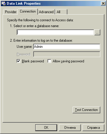 На странице Provider Data Link Propeties выберем Microsoft Jet 4.0 OLE DB Provider, а на вкладке Connection укажем путь и имя базы данных Access