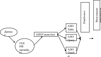 Бросим на форму два компонента ADOConnection, ADOTable с закладки ADO, DataSource с Data Access, DBGrid и DBNavigator c Data Controls.