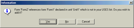 После трансляции получим сообщение о необходимости добавить uses Unit1, нажмем Yes.