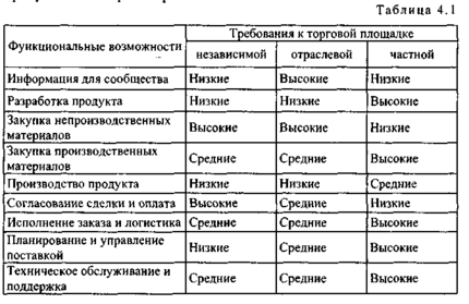 Функциональные возможности торговых площадок. Многие модели электронной торговли предлагают широкий набор функций, но в настоящее время ни одна из них не может поддерживать все функции в равной мере. В каждом конкретном случае наилучшим решением является выбор набора услуг (от информационного наполнения до управления цепочками поставок) и их функциональных возможностей, наиболее полно удовлетворяющих пользователей. Для различных типов площадок требования к функциональности каждой услуги, по данным компании Accenture, заметно различаются (табл. 4.1).