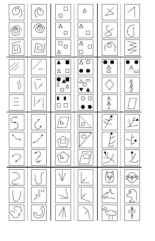 Здесь представлены 12 задач, в которых следует отобрать признаки, при помощи которых можно отличить левую триаду картинок от правой. Решение данных задач требует моделирования логического мышления в полном объеме.