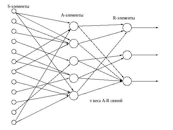 В наиболее простом виде перцептрон (Error: Reference source not found) состоит из совокупности чувствительных (сенсорных) элементов (S-элементов), на которые поступают входные сигналы. S-элементы случайным образом связаны с совокупностью ассоциативных элементов (А-элементов), выход которых отличается от нуля только тогда, когда возбуждено достаточно большое число S-элементов, воздействующих на один А-элемент. А-элементы соединены с реагирующими элементами (R-элементами) связями, коэффициенты усиления (v) которых переменны и изменяются в процессе обучения. Взвешенные комбинации выходов R-элементов составляют реакцию системы, которая указывает на принадлежность распознаваемого объекта определенному образу. Если распознаются только два образа, то в перцептроне устанавливается только один R-элемент, который обладает двумя реакциями — положительной и отрицательной. Если образов больше двух, то для каждого образа устанавливают свой R-элемент, а выход каждого такого элемента представляет линейную комбинацию выходов A-элементов: