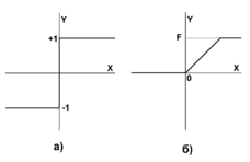 Активационная функция f имеет вид порога (рис. 2б), причем величина F должна быть достаточно большой, чтобы любые возможные значения аргумента не приводили к насыщению.