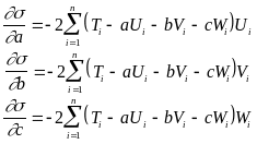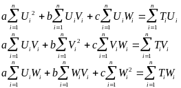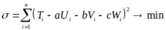 Подберем значения этих параметров так, чтобы была наименьшей сумма квадратов уклонений опытных данных Ti и теоретических Ti = aUi + bVi + cWi, то есть сумма: