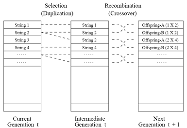 Шаг алгоритма состоит из трех стадий: генерация промежуточной популяции (intermediate generation) путем отбора (selection) текущего поколения (current generation), скрещивание (recombination) особей промежуточной популяции путем кроссовера (crossover), что приводит к формированию нового поколения (next generation), и мутация нового поколения. На рисунке изображены первые две стадии: