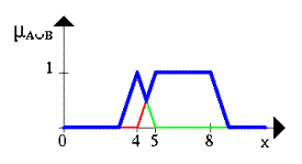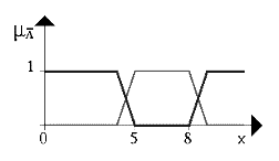 Нечеткое множество между 5 и 8 ИЛИ (OR) около 4 показано на рис. 3 (жирная линия).