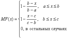 Треугольная функция принадлежности определяется тройкой чисел (a,b,c), и ее значение в точке x вычисляется согласно выражению: