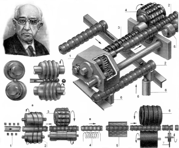 Рис.10. Непрерывная поперечно - винтовая прокатка А.И. Целикова (1904 - 1984).