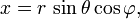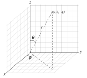 0 ≤ φ ≤ 360° — угол между осью X и проекцией отрезка, соединяющего начало координат с точкой P, на плоскость XY(в Америке углы θ, φ меняются ролями).