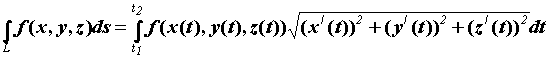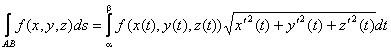 a £ t £ b, где функции х, у, z – непрерывно дифференцируемые функции параметра t, причем точке А соответствует t = a, а точке В соответствует t = b. Функция f(x, y, z) – непрерывна на всей кривой АВ.