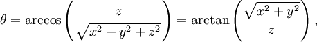 0 ≤ θ ≤ 180° — угол между осью Z и отрезком, соединяющим начало координат и точку P.