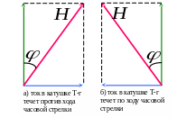 , созданное током, протекающим по виткам катушки тангенс-гальванометра, направлено вдоль оси катушки и перпендикулярно плоскостям витков с током. Тогда в горизонтальной плоскости поверхности Земли обнаруживаются взаимно ортогональные поля