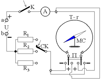 Здесь: a, b – клеммы источника напряжения U постоянного тока; K – выключатель источника питания; A – амперметр источника напряжения, контролирующий ток в витках катушки тангенс-гальванометра; R1, R2, R3 – активные сопротивления дискретного реостата источника питания; СК – скользящий контакт штурвального зубчатого колеса дискретного реостата источника питания (совмещен с амперметром А); П – двухполюсный переключатель (тумблер), позволяющий менять направление тока в витках катушки тангенс-гальванометра; Т-г – тангенс-гальванометр, состоящий из короткой по длине катушки и свободно вращающейся магнитной стрелки МС, помещенной в центр катушки.