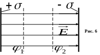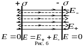 .2.2. Поле между двумя бесконечно протяженными, разноименно заряженными параллельными плоскостями, (см. рис. 6). Вне внутреннего промежутка,