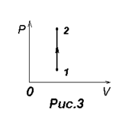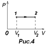 | Для него P=const. Диаграмма этого процесса (изобара) изображена на рис.4. Практически он осуществляется, например, при нагревании (процесс 1-2) или охлаждении (процесс 2-1) газа, находящегося в цилиндре с подвижным поршнем, на который действует постоянное внешнее давление. Учитывая, что для произвольной массы газа U=(i/2)RT, |