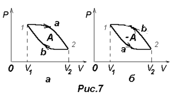 (цикл протекает против хода часовой стрелки), то он называется обратным (рис.7,б). В случае обратного цикла внешние тела совершают над газом положительную работу – работу по сжатию газа А. Газ в этом случае совершает отрицательную работу А=-А.