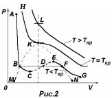 Возвращаясь к анализу изотерм ВдВ, изображенных на рис.2, делаем заключение, что область, ограниченная сверху изотермой НК и справа линией КВМ соответствует жидкой фазе. Область, ограниченная сверху кривой МВКFN, соответствует жидкой и газообразной фазе (жидкость + пар) и область, расположенная правее линии НКFN, соответствует газообразной фазе.