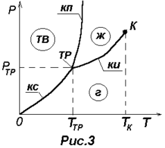 | На рис.3 изображена характерная диаграмма состояния вещества. Три фазы одного и того же вещества (твердая, жидкая и газообразная) могут находиться в равновесии только при единственном значении температуры ТТР и давлении РТР. Эту точку называют тройной (ТР). В тройной точке сходядтся три кривые равновесия фаз, взятых попарно: 1) кривая испарения (КИ) определяет условия равновесия между жидкой и газообразной фазами (например, между водой и водяным паром); |