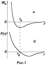 | Характерный график зависимости потенциальной энергии Wn взаимодействия двух молекул от расстояния между ними r представлен на рис.1а. При r=r0 энергия имеет минимум, следовательно, при r=r0 две взаимодействующие молекулы находятся в положении устойчивого равновесия. При r<r0 молекулы отталкиваются, а при r>r0 – притягиваются. График зависимости силы взаимодействия между молекулами F(r)= - dWn/dr от расстояния между ними представлен на рис.1б. Если молекулы находятся на расстоянии r, сравнимом с r0, то молекулы действуют друг на друга с некоторой силой. |