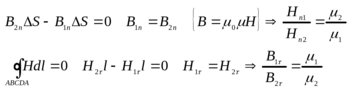 При переходе через границу раздела двух магнетиков нормальная составляющая вектора В, и тангенциальная состовляющая вектора Н изменяются непрерывно (не претерпевают скачка), а B и Hn претерпевают скачок