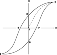 Она характеризует неоднозначную зависимость намагниченности магнитоупорядоченного материала от напряженности намагничивающего поля. С увеличением напряженности магнитного поля от исходной (нулевой) точки (1) намагничивание идет по штриховой линии 1–2, причем величина m существенно изменяется по мере того, как возрастает намагниченность образца. В точке 2 достигается насыщение, т.е. при дальнейшем увеличении напряженности намагниченность больше не увеличивается. Если теперь постепенно уменьшать величину H до нуля, то кривая B(H) уже не следует по прежнему пути, а проходит через точку 3, обнаруживая как бы «память» материала о «прошлой истории», откуда и название «гистерезис». Очевидно, что при этом сохраняется некоторая остаточная намагниченность (отрезок 1– 3). После изменения направления намагничивающего поля на обратное кривая В (Н) проходит точку 4, причем отрезок (1)–(4) соответствует коэрцитивной силе, препятствующей размагничиванию. Дальнейший рост значений (-H) приводит кривую гистерезиса в третий квадрант – участок 4–5. Следующее за этим уменьшение величины (-H) до нуля и затем возрастание положительных значений H приведет к замыканию петли гистерезиса через точки 6, 7 и 2.