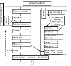 В звездах образуются ядра атомов, а на периферии – возникают сами атомы. В результате взаимодействия атомов формируются молекулы. За молекулами следует уровень макротел (жидких, твердых, газообразных). Особый тип макротел образуют планеты – тела со сложной внутренней структурой, имеющие ядро, литосферу, иногда атмосферу и гидросферу. Звезды и планеты составляют планетные системы.