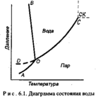 бласти, находящиеся между кривыми, являются однофазовыми областями (С = 2). Кривые соответствуют условиям равновесия между двумя фазами (С = 1). Кривая ОС отражает равновесие процесса кипения. Кривая кипения оканчивается точкой С, которая называется критической. При температуре выше этой точки невозможно получить жидкую воду ни при каком давлении. Вода при температурах выше критической и давлении, выше критического переходит в особое состояние, называемое сверхкритическим (СК). Свойства веществ в этом состоянии находятся между свойствами газа и жидкости. Например, вещества в сверхкритическом состоянии имеют очень низкую вязкость, высокие диффузионную активность и способность растворять многие вещества в твердом, жидком или газообразном видах. Кривая ОВ — это кривая плавления. При увеличении давления температура плавления несколько уменьшается, что обусловлено разрывом водородных связей при повышении давления. Для большинства веществ температура плавления немного возрастает с увеличением давления. Кривая ОА отражает процесс сублимации, т. е. перехода из твердого состояния в газообразное, минуя жидкое. Кривая ОD описывает поведение воды в неустойчивом (метастабильном) состоянии. Явление образования метастабильного состояния получило название переохлаждения.