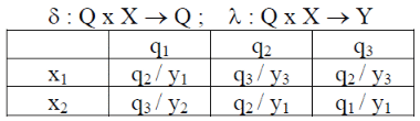 Иногда при задании автоматов Мили используют одну совмещенную таблицу переходов и выходов, в которой на пересечении столбца qm и строки xf записываются в виде qs / yg следующее состояние и выдаваемый выходной сигнал.