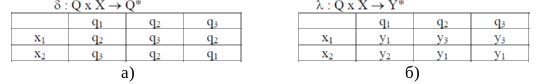 На пересечении столбца qm и строки xf в таблице переходов ставится состояние qs = δ (qm, xf), в которое автомат переходит из состояния qm под действием сигнала xf, а в таблице выходов – соответствующий этому переходу выходной сигнал yg = λ (qm, xf).