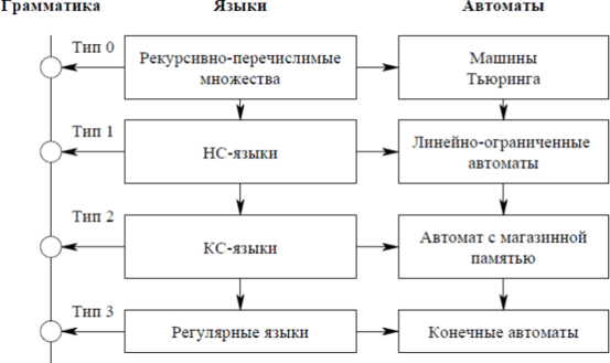 С другой стороны, типы языков могут быть определены типами абстрактных распознающих устройств (автоматов). При этом язык определяется как множество цепочек, допускаемых распознающим устройством определенного типа. На рис. 3.1 приведена иерархия языков и соответствующие ей иерархии грамматик и автоматов как распознающих устройств. Любое множество, порождаемое автоматическим устройством произвольного вида, порождается некоторой грамматикой типа 0 по Хомскому.