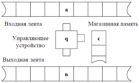 Конечное управляющее устройство (УУ) снабжается дополнительной управляющей головкой, всегда указывающей на верхнюю ячейку магазинной памяти: за один такт работы автомата управляющая головка может произвести следующие движения: