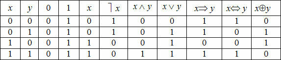 1. Таблица истинности для элементарных булевых функций имеет вид, представленный в табл. ниже.