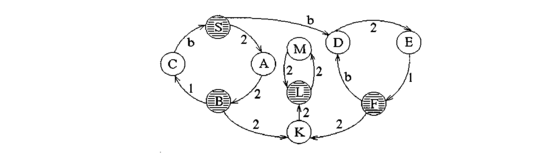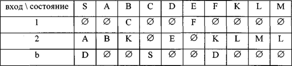 M = ({А, В, С, S, D, Е, F, К, L, М), {1, 2, b}, d, {S}, (S, В, F, L}), где {А, В, С, S, D, Е, F, К, L, М} — конечное множество состояний; {1, 2, Ь} — конечный входной алфавит; d — множество переходов: