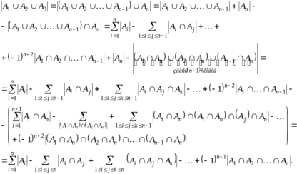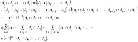 В правой части этой формулы, называемой формулой включения исключения, стоят с чередующимися знаками скобки, содержащие всевозможные попарные пересечения множеств