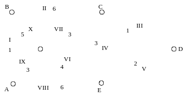 Известны точки, в которых будут расположены населённые пункты (A,B,C,D,E) и известны трасы дорог (I,II,III,IV,V,VI,VII,VIII,IX,X), которые можно построить, а также стоимости из строительства (1,2,3,4,5,6).