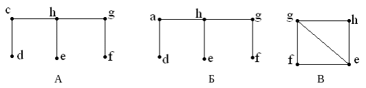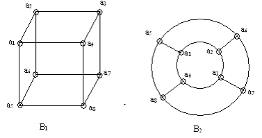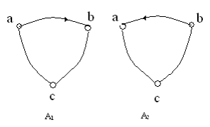 Решение. Графы А1 и А2 не изоморфны, хотя они и имеют одинаковое число вершин и ребер. Но в графе А1 одно из ребер направлено от а к b, а в графе А2 оно направлено в другую сторону. Графы В1 и В2 изоморфны, т.к. они имеют одно и то же число вершин и любые две вершины графа В1 соединены ребром только тогда, когда соответствующие им вершины графа В2 также соединены ребром.